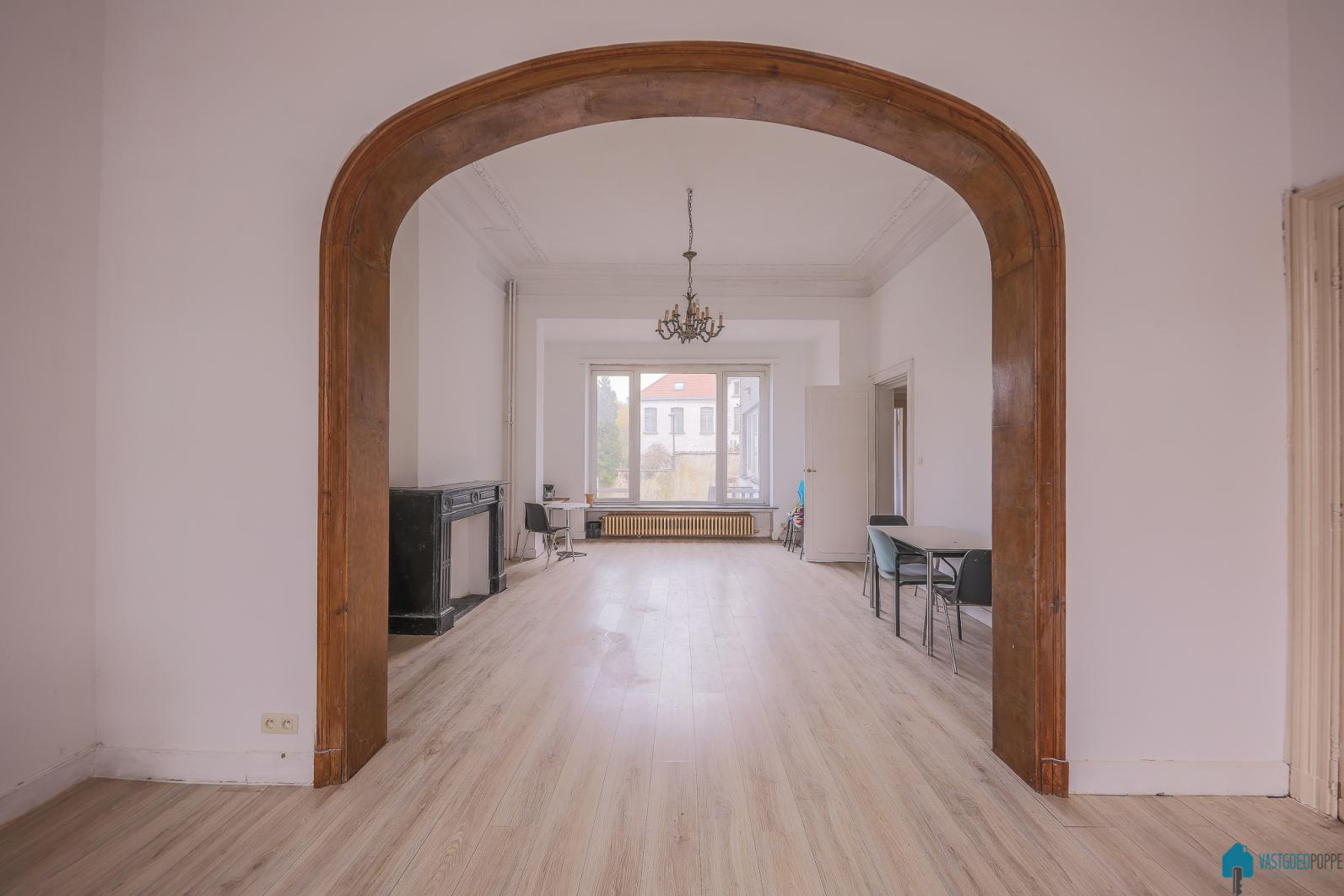 Via de imposante inkomhal met authentieke elementen betreden we een ruimte leefruimte met keuken achteraan.